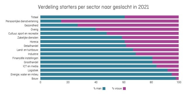 - In 2021 zit de grootste groei van het aantal starters in de sectoren gezondheid (+27%), bouw (+19%),logistiek (+19%) en horeca (+15%).
